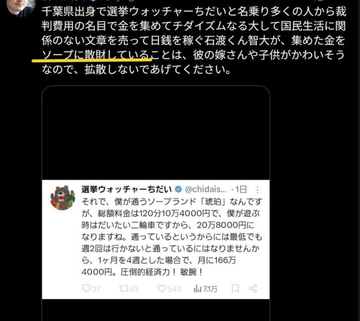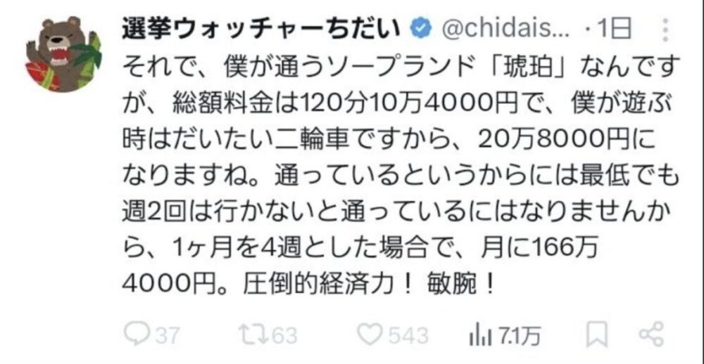 石渡智大(選挙ウォッチャーちだい)は週2回でソープランド通い?